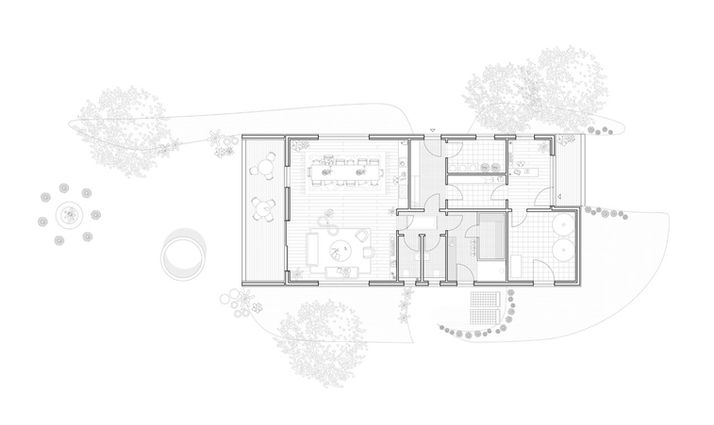Alles aus Holz! 9 Ferienhäuser mit Platz für je 6 Personen fügen sich um einen zentralen Gemeinschaftsbereich mit Langhaus und Spiel- und Aufenthaltsflächen. Die Häuser mit ihren begrünten asymmetrischen Satteldächern ducken sich vor der starken Brise aus Westen. Bei niedriger Traufhöhe ensteht innen ein großzügiger Raum, der bis zum First ausgebaut ist und zum Kochen, Essen und Wohnen einlädt. Ein gemütliches Sitzfenster neben dem Kamin bildet das Passpartout für den Blick auf die private Terrasse und dann in die Natur. Das Langhaus im Zentrum dient dem Ankommen und dem Zusammenkommen.Es verfügt über den Empfang, einen Saunabereich und einen Gemeinschaftsraum mit Küchenzeile.